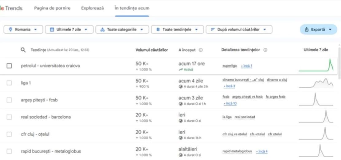 Instrumente precum Semrush Keyword Overview sau Google Trends te pot ajuta să verifici toate aceste date: dificultatea, volumul, CPC-ul (care indică potențialul de conversie) și chiar evoluția în timp a termenilor. În captura de mai jos, poți vedea ce s-a căutat cel mai mult pe Google, în România, în ultimele 7 zile (până la 20.01.2026, data redactării acestui articol):